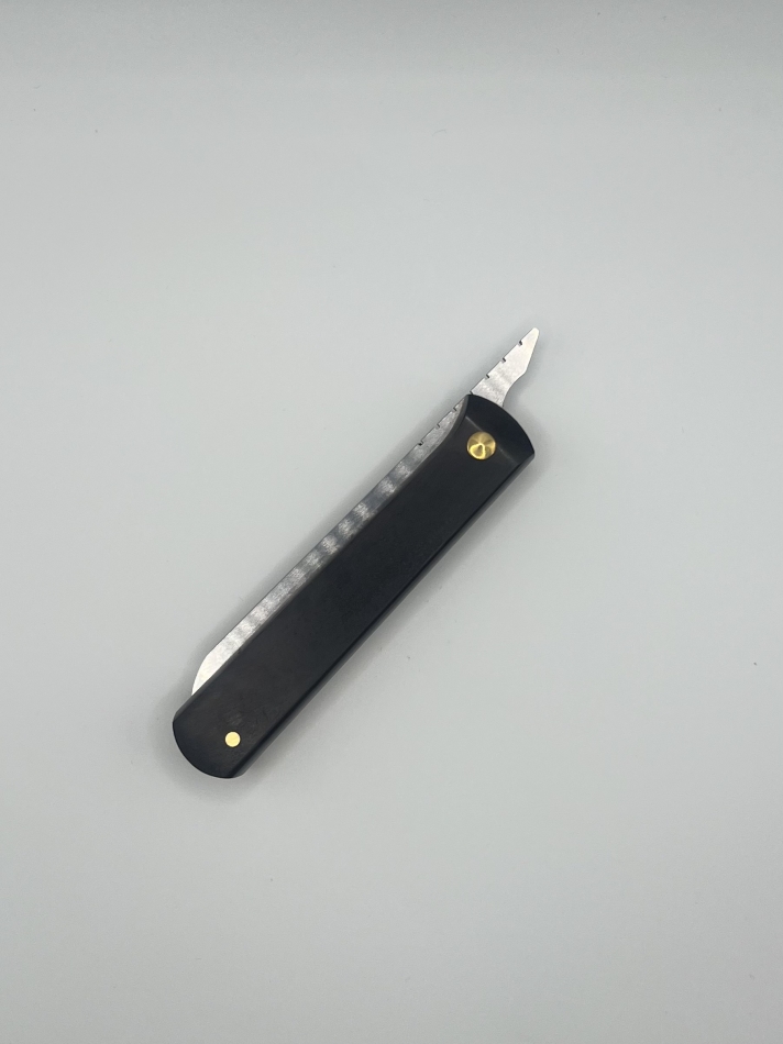 Folding knife, Razor model, with double carbon steel blade, thickness 3 mm, length 80 mm, mounted on handle in ebony.